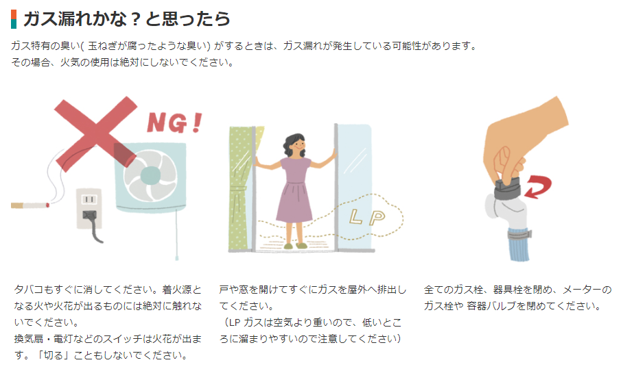※ガス特有の臭い(玉ねぎが腐ったような臭い)がするときや、上記の手段で復帰しない、あるいは復帰してもすぐに遮断される場合は、ガス漏れの場合がありますのでシンサナミへご連絡ください。またその場合、火気の使用は絶対にしないでください。
